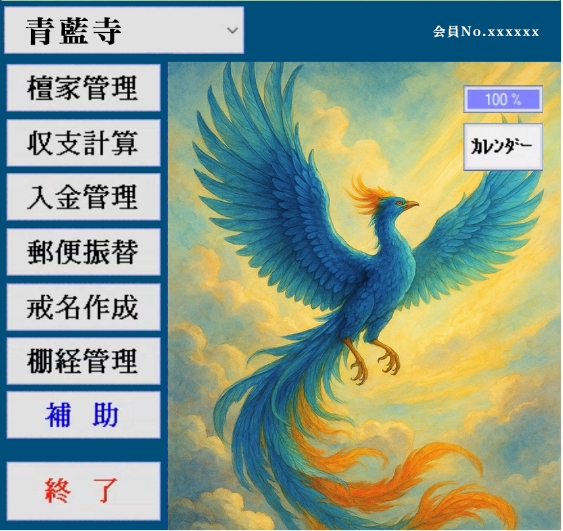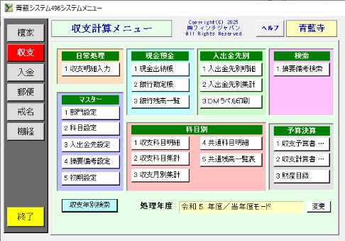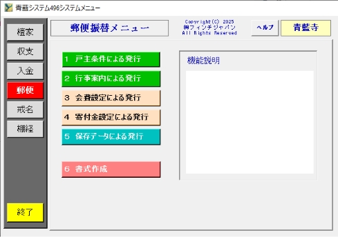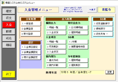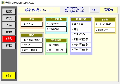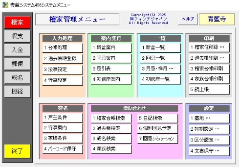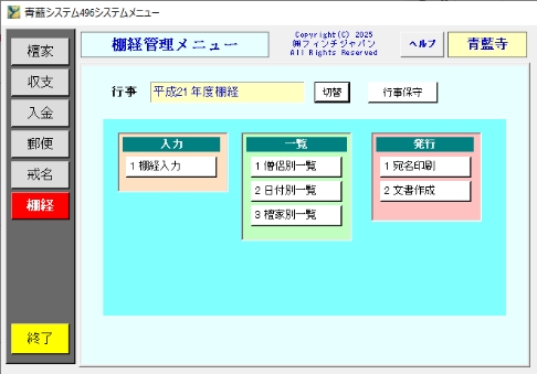 製品の一つが寺院管理の総合システムである「青藍システム496」であり、寺務に携わるユーザ様のご支援を受けながら、「檀家管理」、「収支計算」、「入金管理」、「戒名作成」、「郵便振替」、「棚経管理」など各宗派にきめ細かく対応した寺務管理の総合システムとして提供しております。